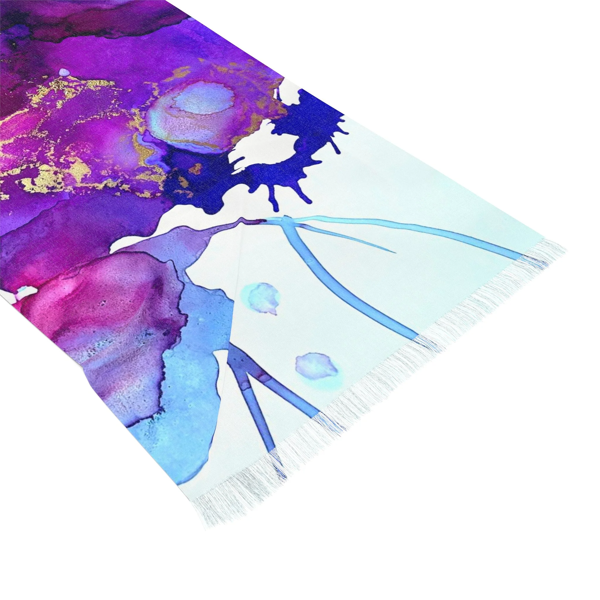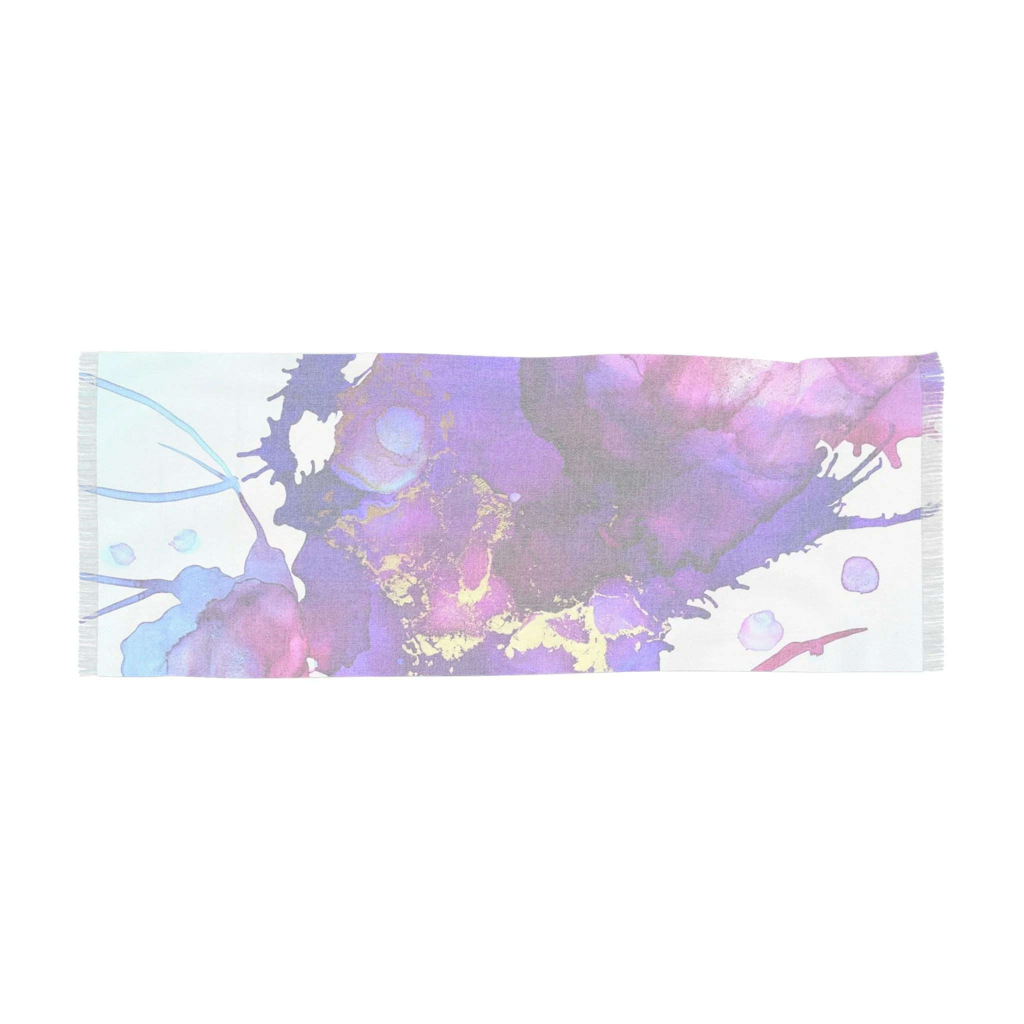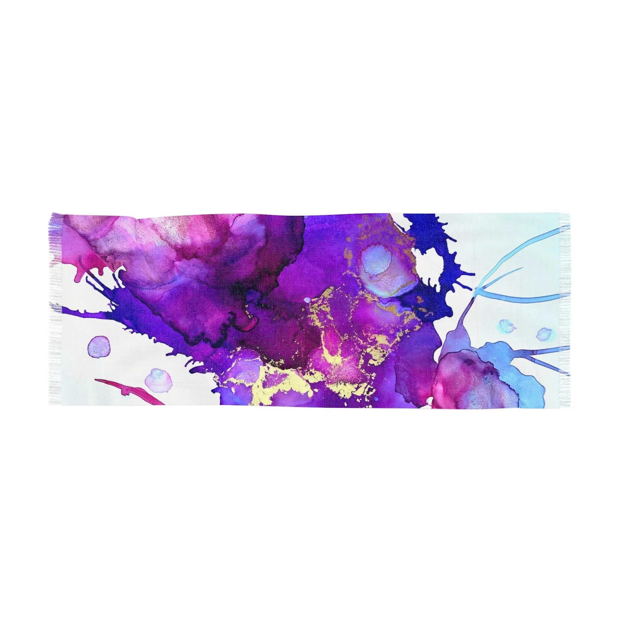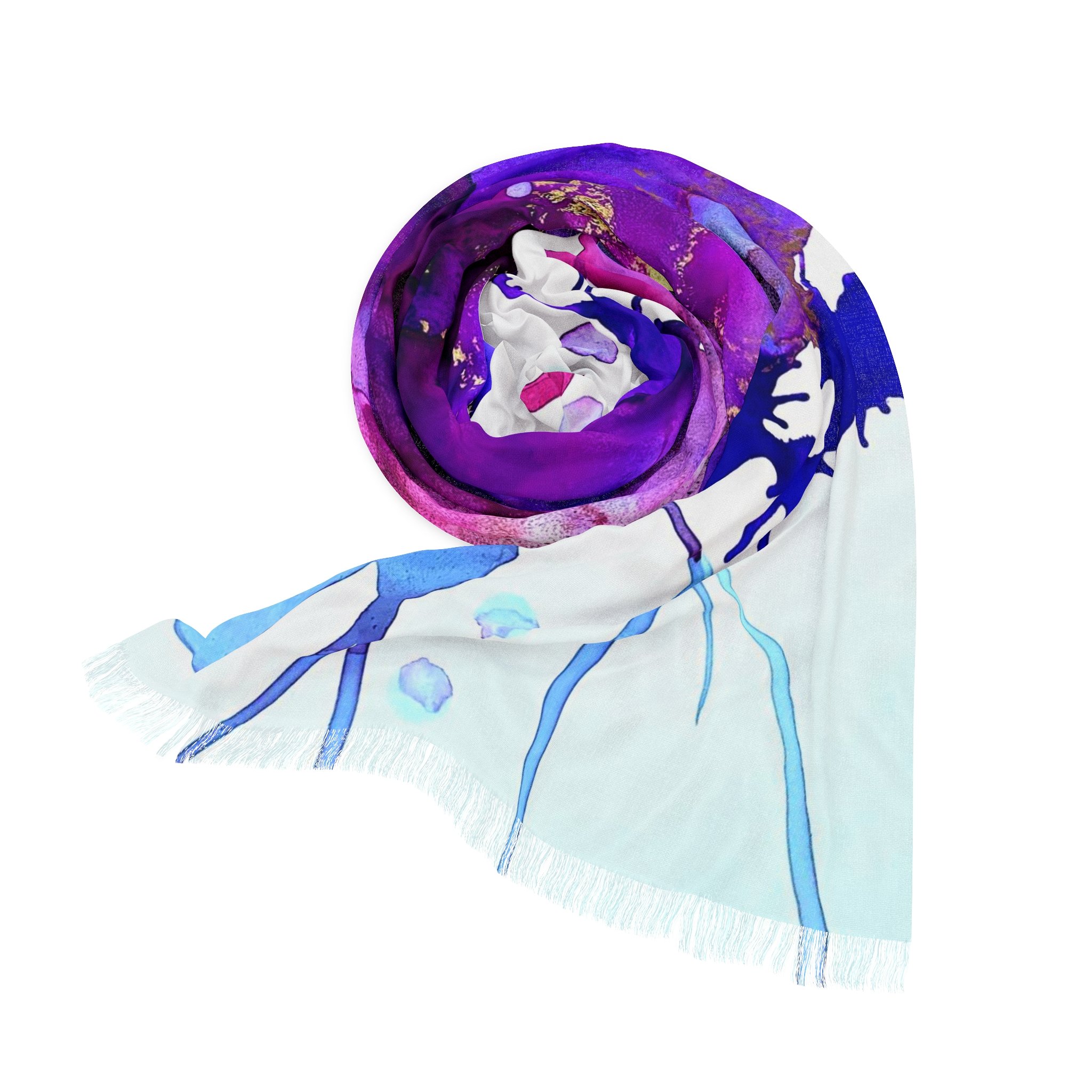 Sure to be a wardrobe favorite, this lightweight scarf features purples, pinks, blues and gold and is made from an original alcohol ink design.