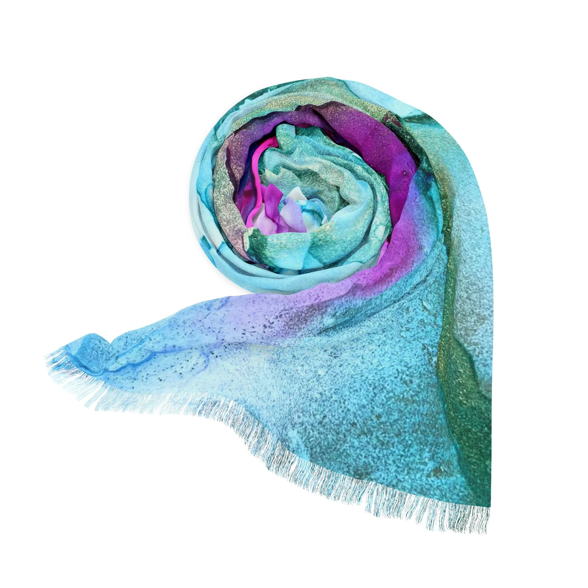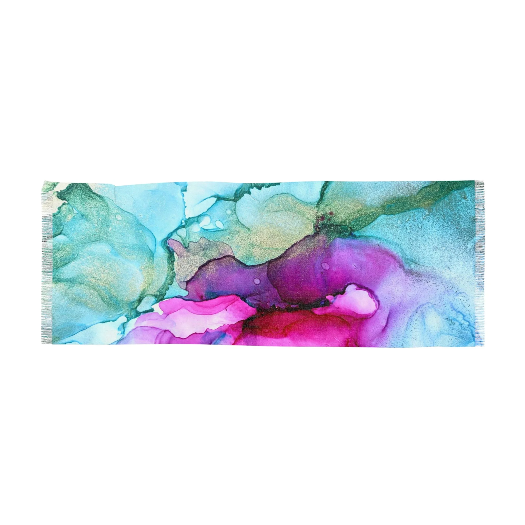 Sure to be a wardrobe favorite, this lightweight scarf features rosehip pink, teals and mint green and is made from an original alcohol ink design.